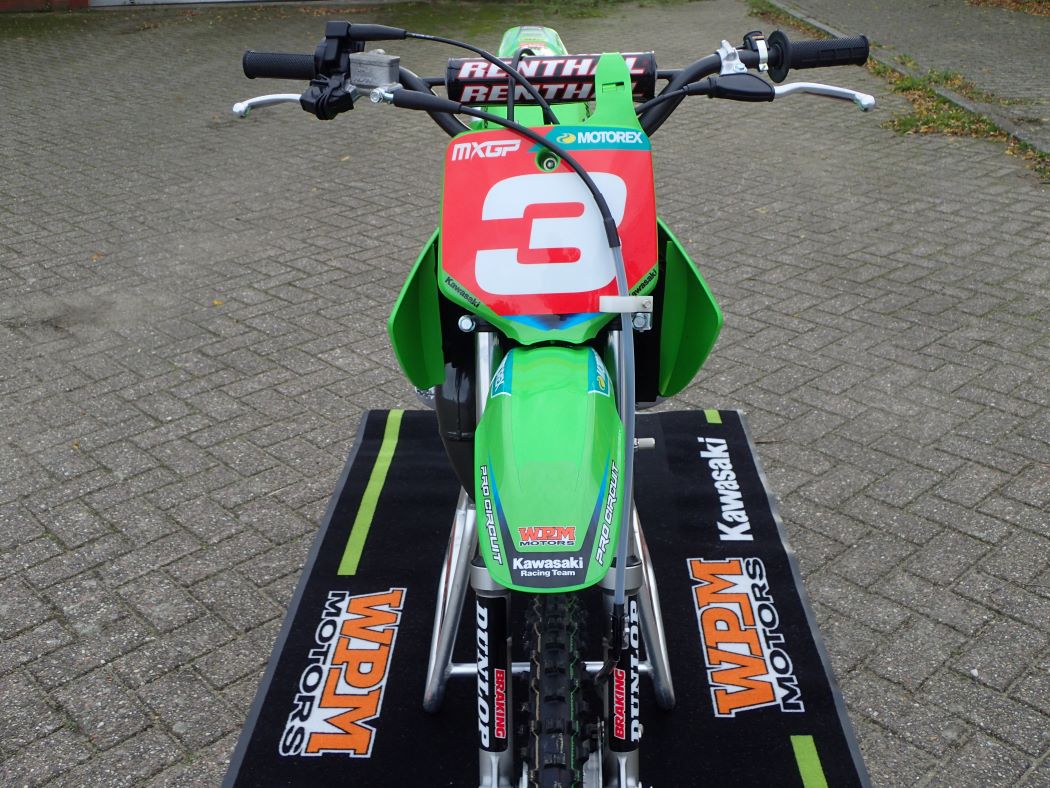 Hoe gaaf , een echte replica van de KX450 van Romain Febre, de Wereldkampioen MX1 2025. We kunnen ons voorstellen dat je nog niet zo hard gaat, maar als look a like sla je zeker geen flater en….. je krijgt hem afgeleverd inclusief je eigen gekozen nummer en naam in de sticker set ….. en de prijs € 3950.- rijklaar !!!